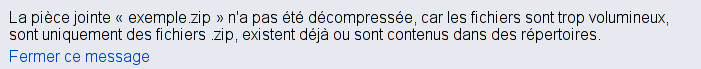 Si la taille totale des fichiers décompressés dépasse l'espace maximal alloué aux pièces jointes, le message d'avertissement suivant sera affiché :